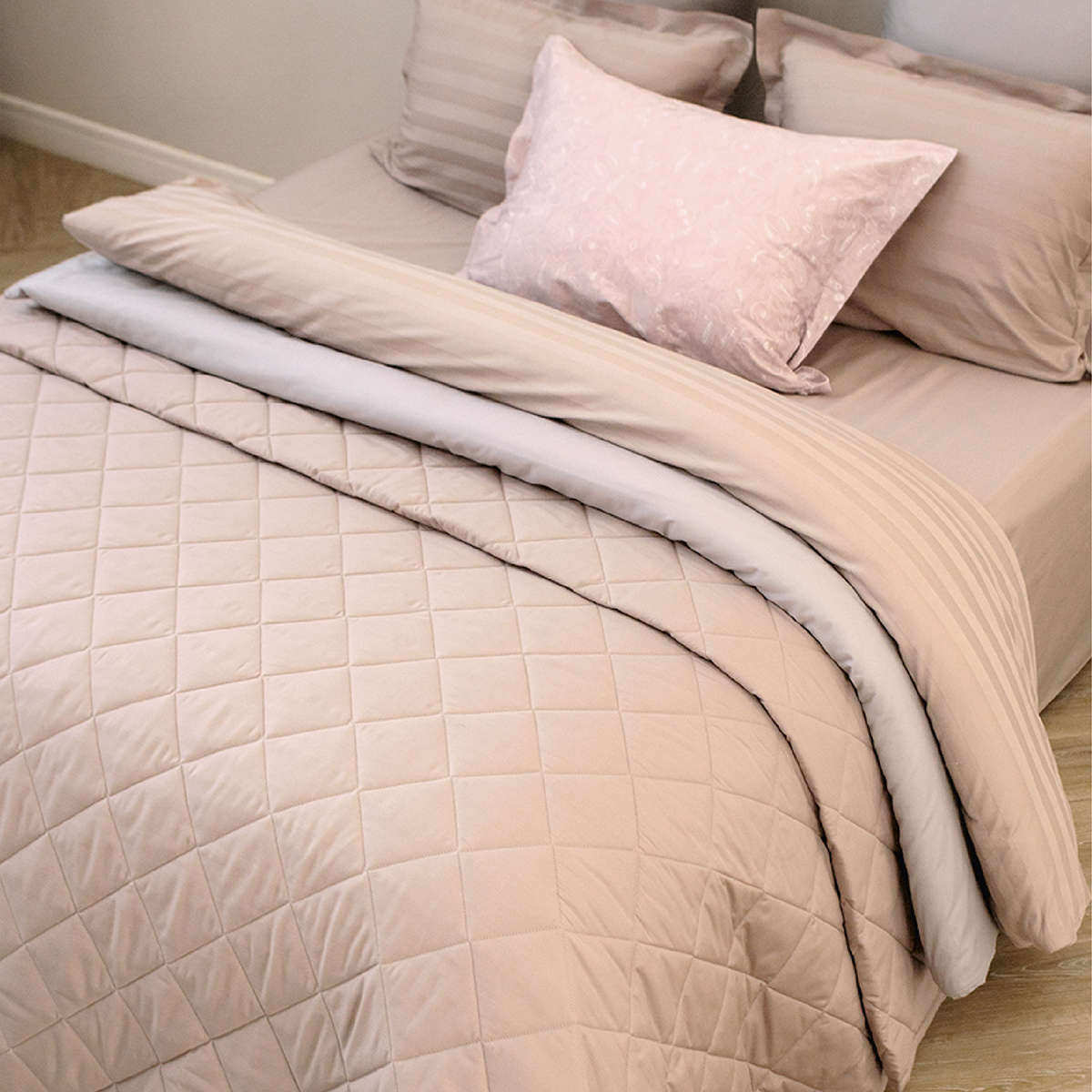Удобное решение для оформления интерьера в едином стиле - покрывала выполнены в тех же расцветках и из той же ткани, что и однотонное постельное белье La Prima.