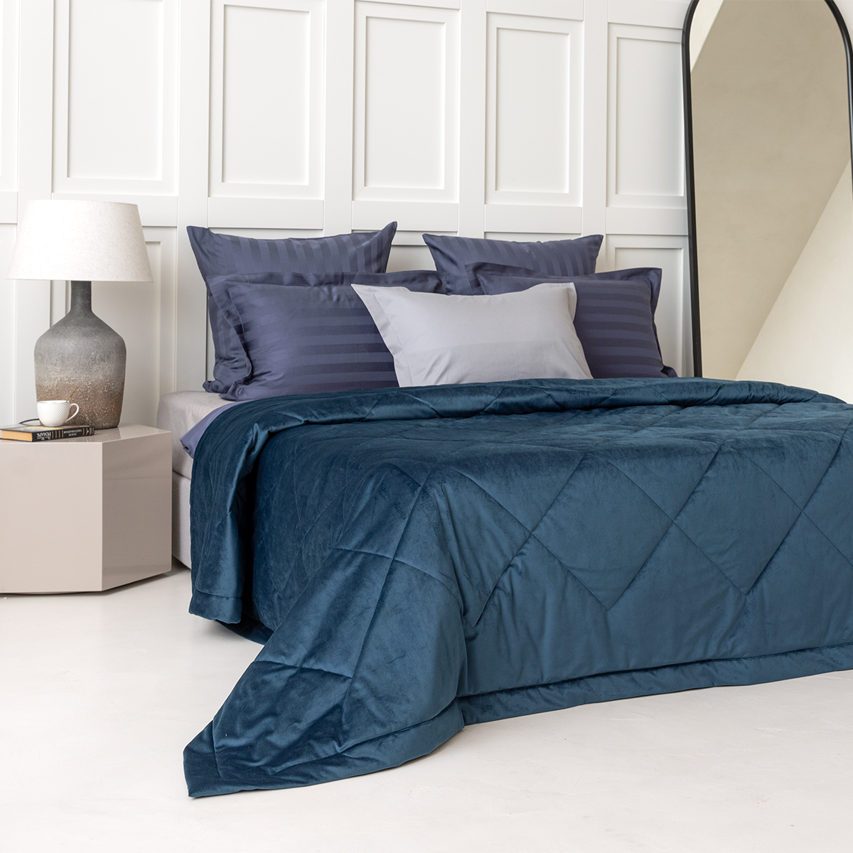 Состав: бархат 100% пэ, наполнитель - полиэфирное волокно. Подклад покрывала – микрофибра велюр, за счет своей фактуры он предотвращает скольжение покрывала на кровати. Стежка в виде ромбов.