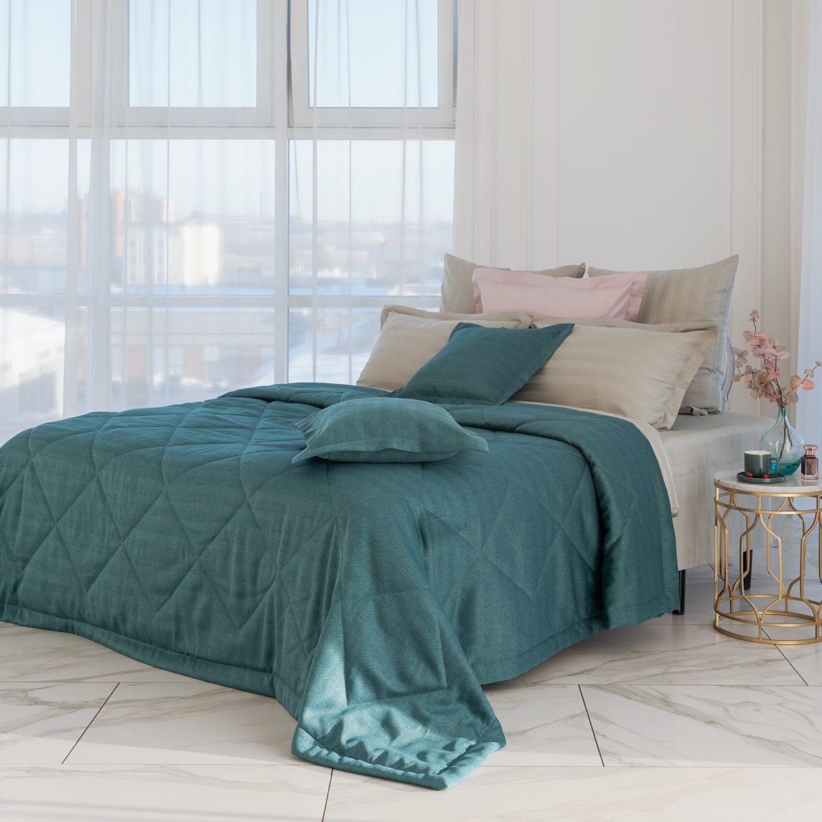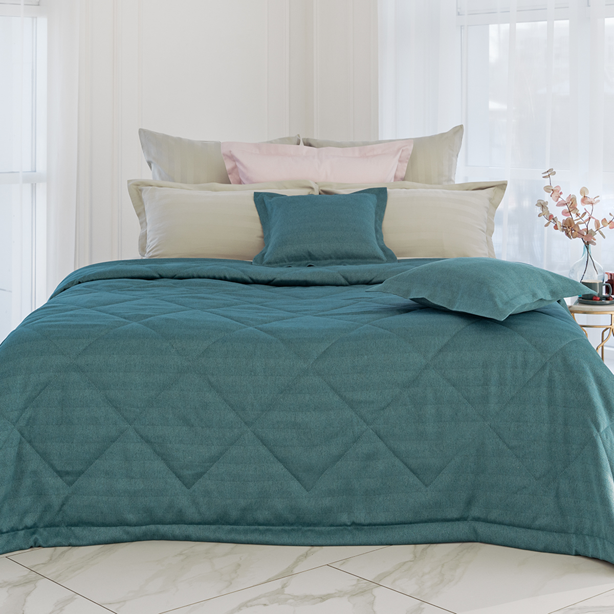 За покрывалом очень легко ухаживать, его можно стирать в домашних условиях при температуре 30С. Покрывало на кровать отлично держит форму и не дает усадку.