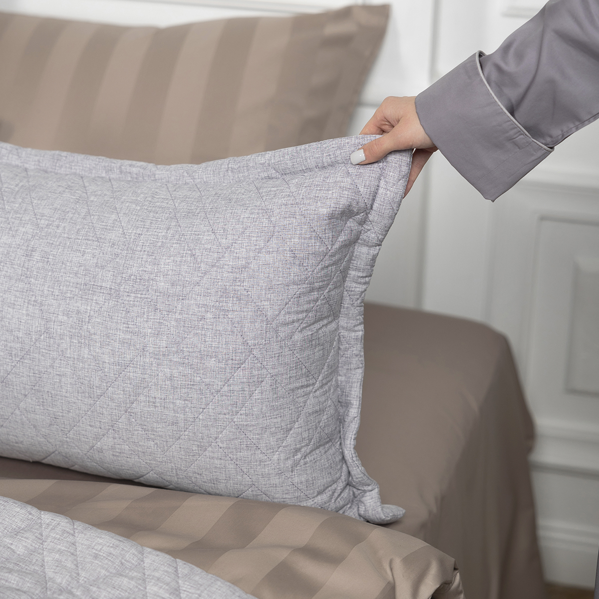 В комплект входит: покрывало на кровать 220x240 см и декоративные стеганые наволочки 50x70 см с ушками – 2шт. Состав: 60% вискозы и 40% хлопка, обеспечивает нежное прикосновение и комфортный сон. Покрывало имеет тактильно приятную Soft Touch фактуру и матовую поверхность для максимального комфорта. Не скользит, идеально принимает форму кровати.