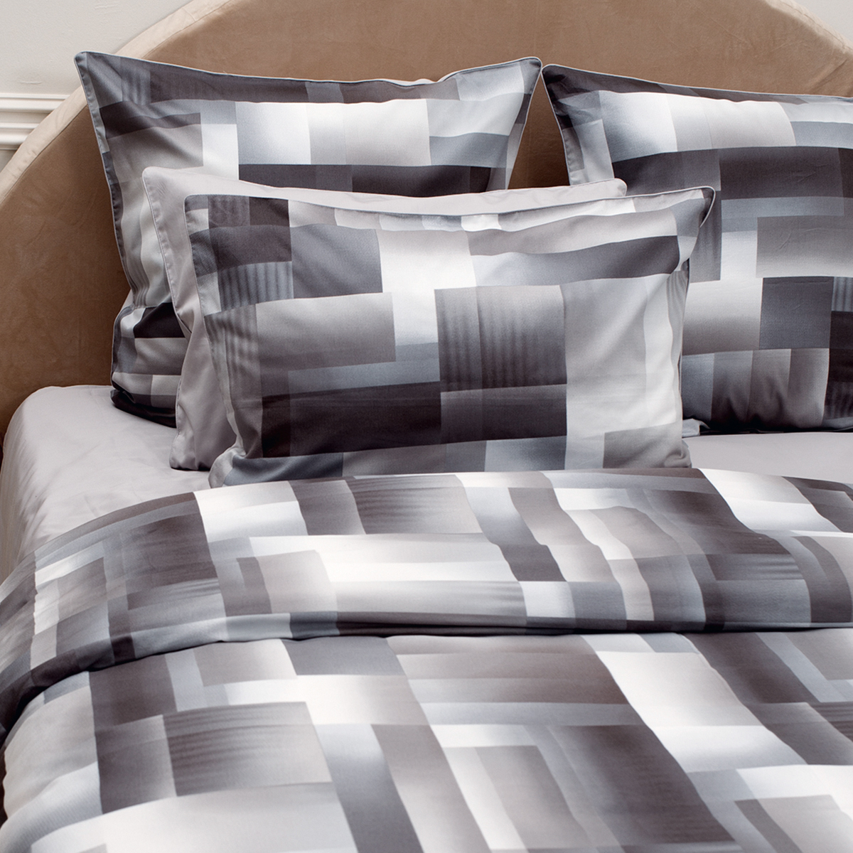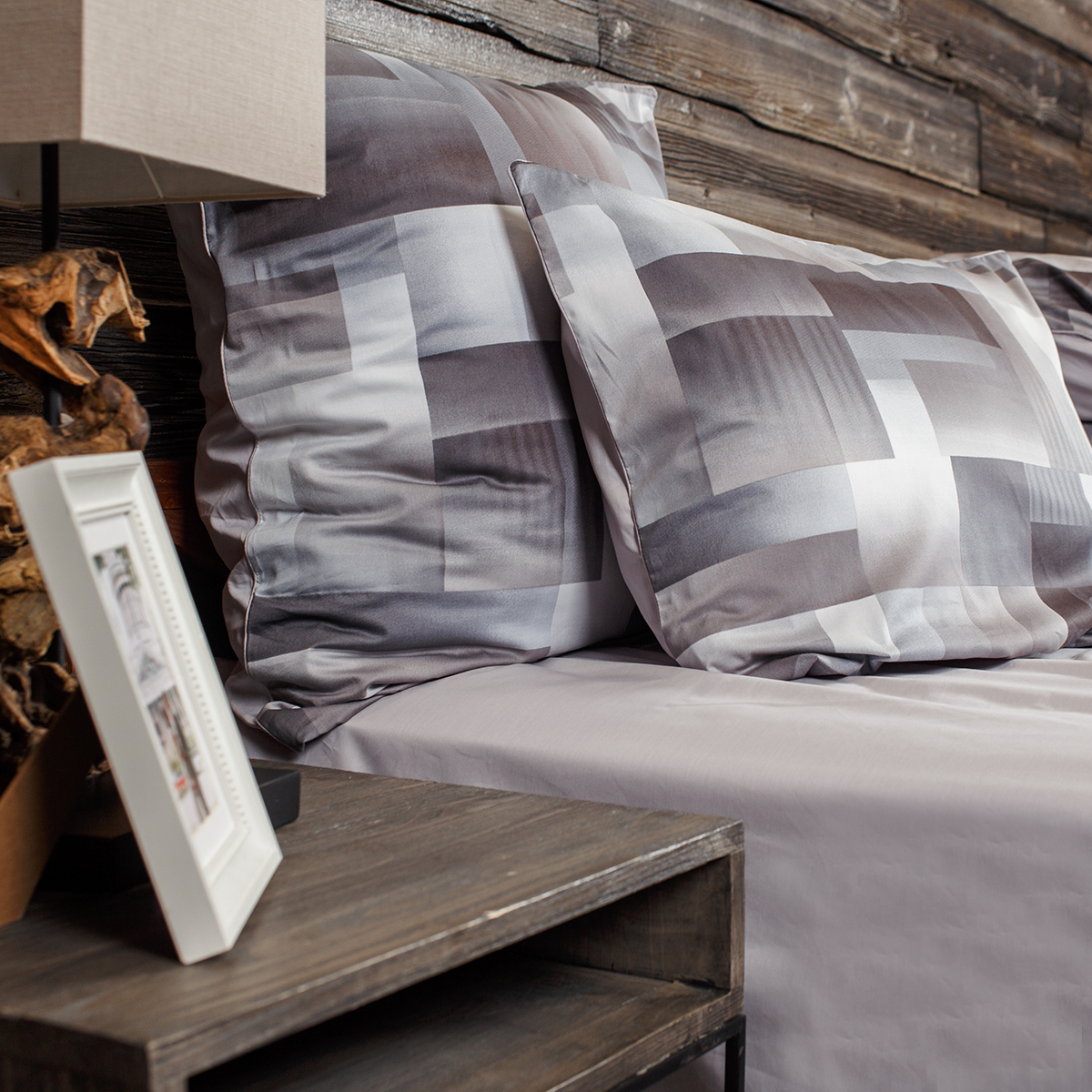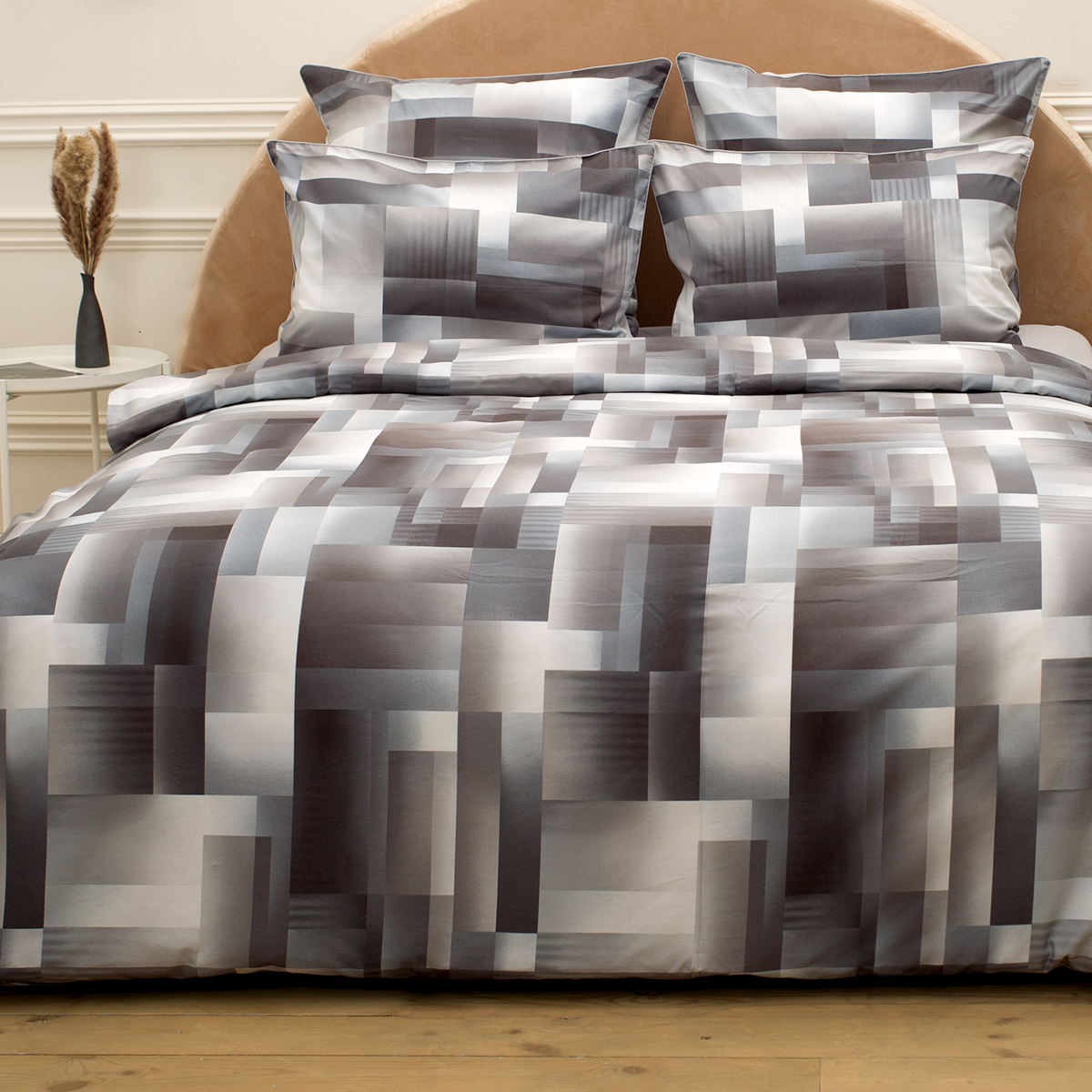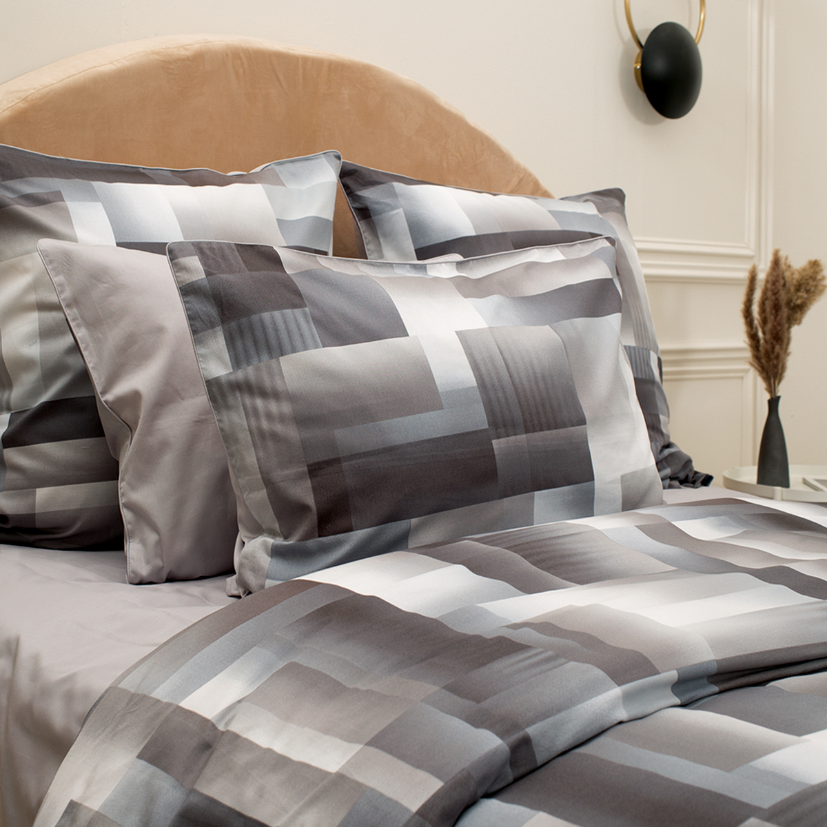 - Наволочки двухсторонние: лицевая сторона– геометрический принт, оборотная – однотонная. Декоративный кант по трем сторонам наволочки. Широкий запах на наволочках - легко менять подушки.