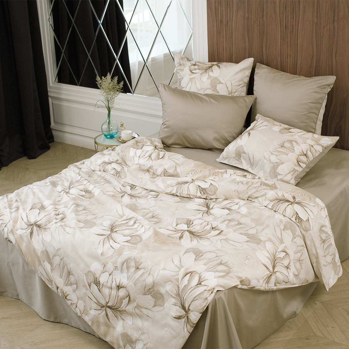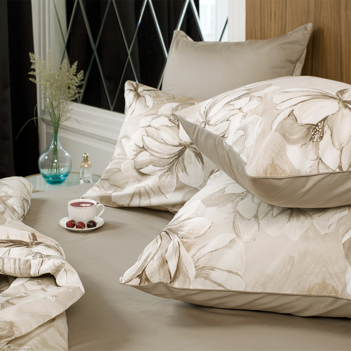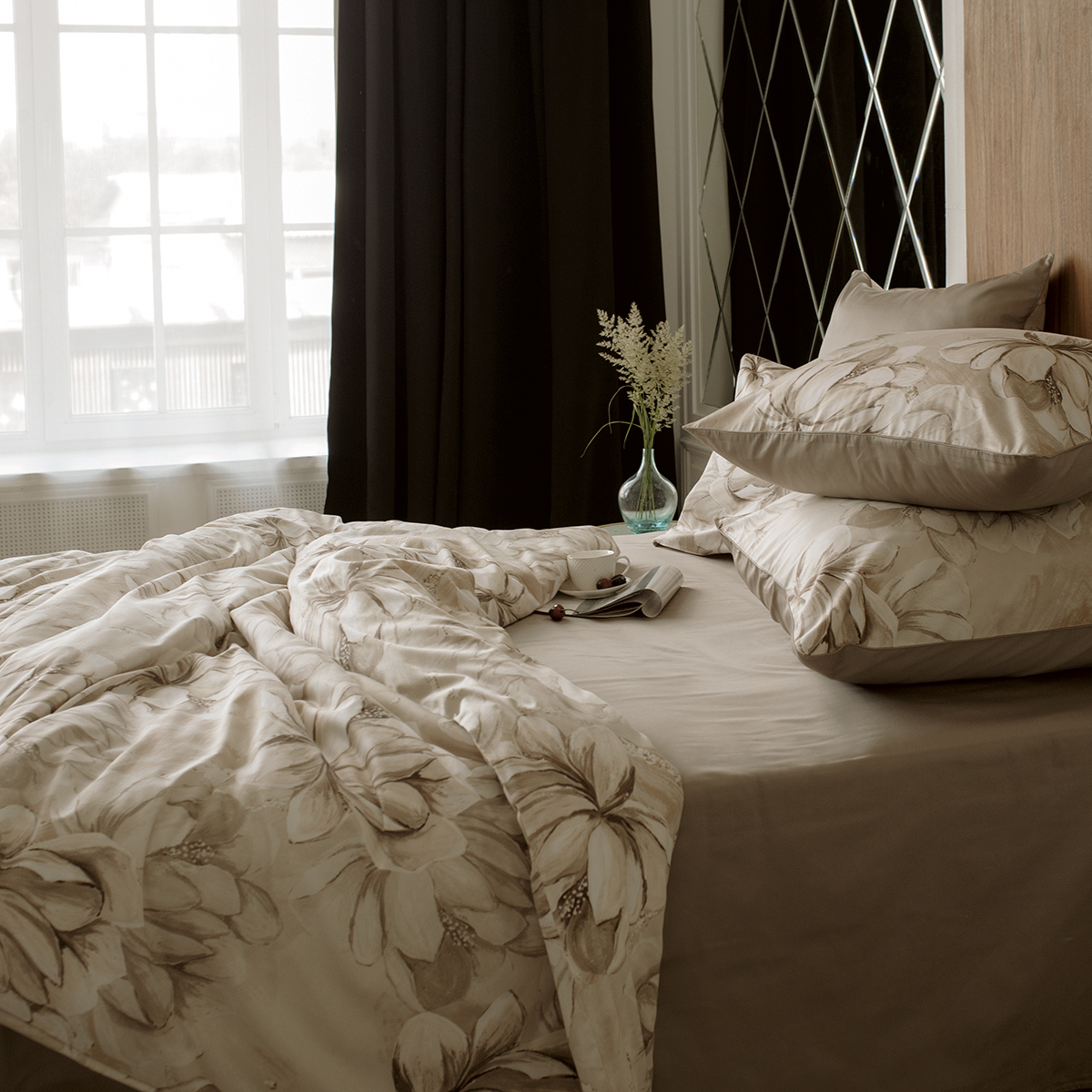 В ткани мако-сатин, из которой произведена коллекция, используется более тонкая 60-я нить. Плотность ткани 300 ТС. За счет специальной скрутки нити, ткань получается очень мягкая и приятная на ощупь.