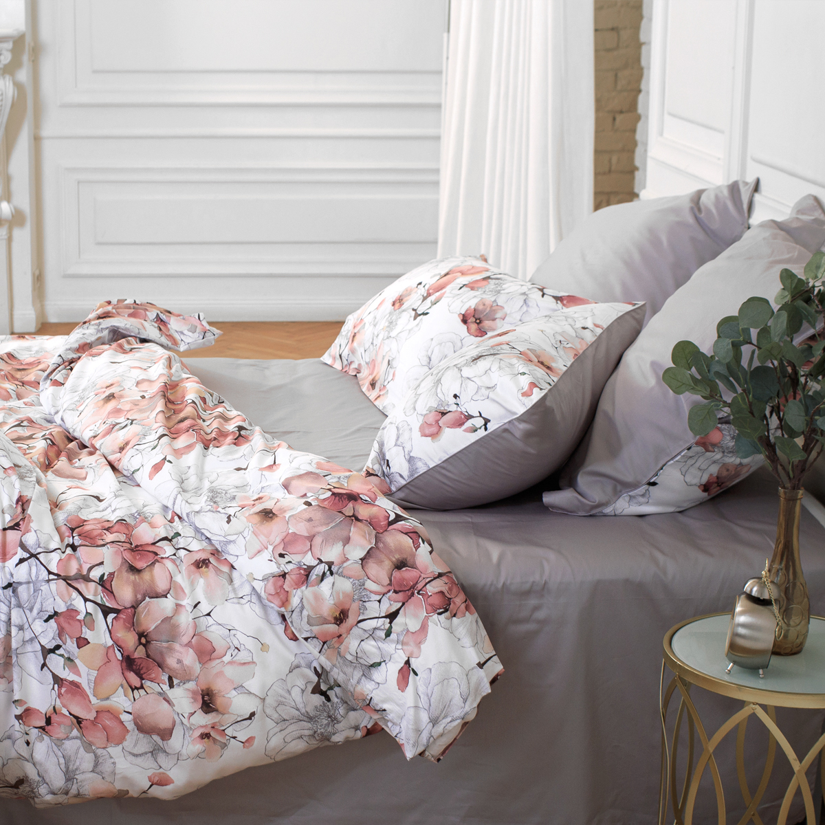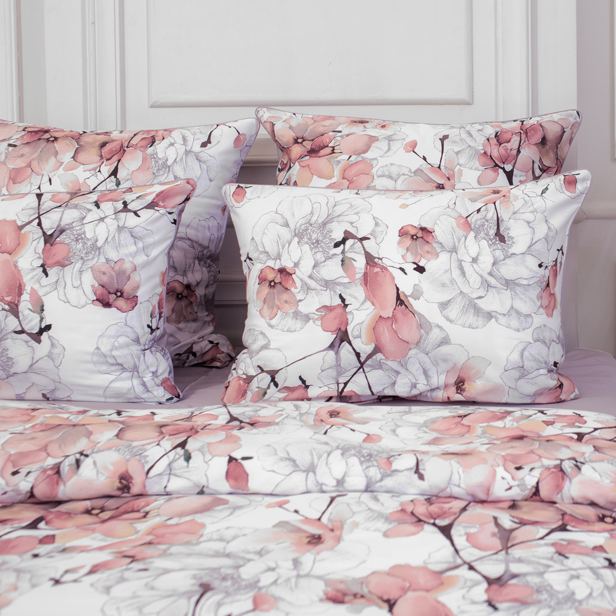 - Наволочки двухсторонние: лицевая сторона – цветочный принт, оборотная – однотонная. Декоративный кант по трем сторонам наволочки.