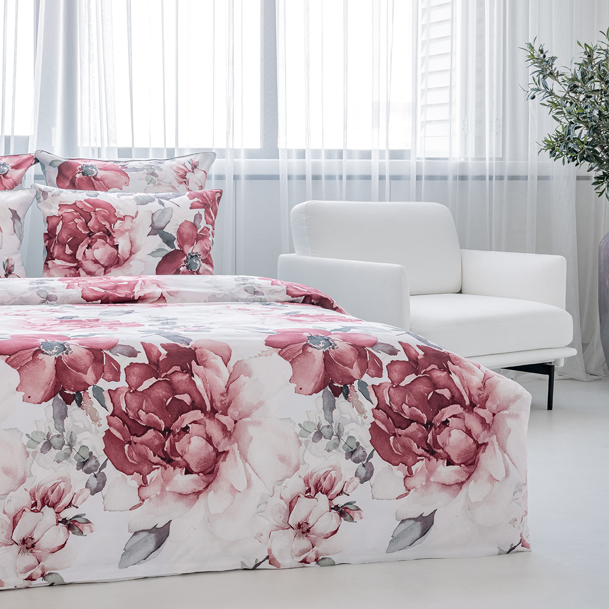 Эффектный акварельный принт, созданных искусным художником. Яркая и сочная красота крупных бутонов чарует и манит… Изящество и нежную красоту роскошного дизайна подчеркивает нежный белоснежный фон комплекта.
