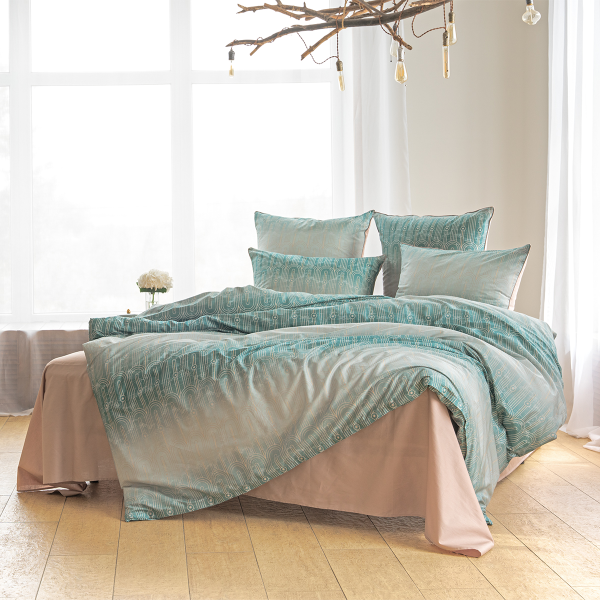 Постельное белье «Массимо» - чарующий градиент от глубокого нефритового оттенка до мягкого бежевого. Изящные линии орнамента напоминают стилизованную решетку итальянских палаццо.