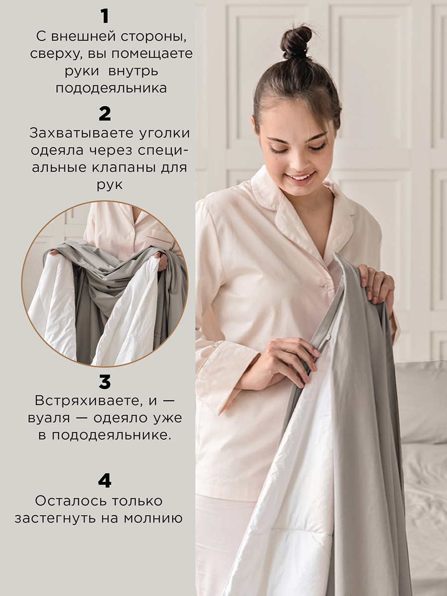 ПОДОДЕЯЛЬНИК С КЛАПАНАМИ ДЛЯ РУК — это то, с чем вы перестанете тяжело вздыхать при вдевании одеяла. Молния во всю ширину пододеяльника в цвет комплекта. Как это работает: