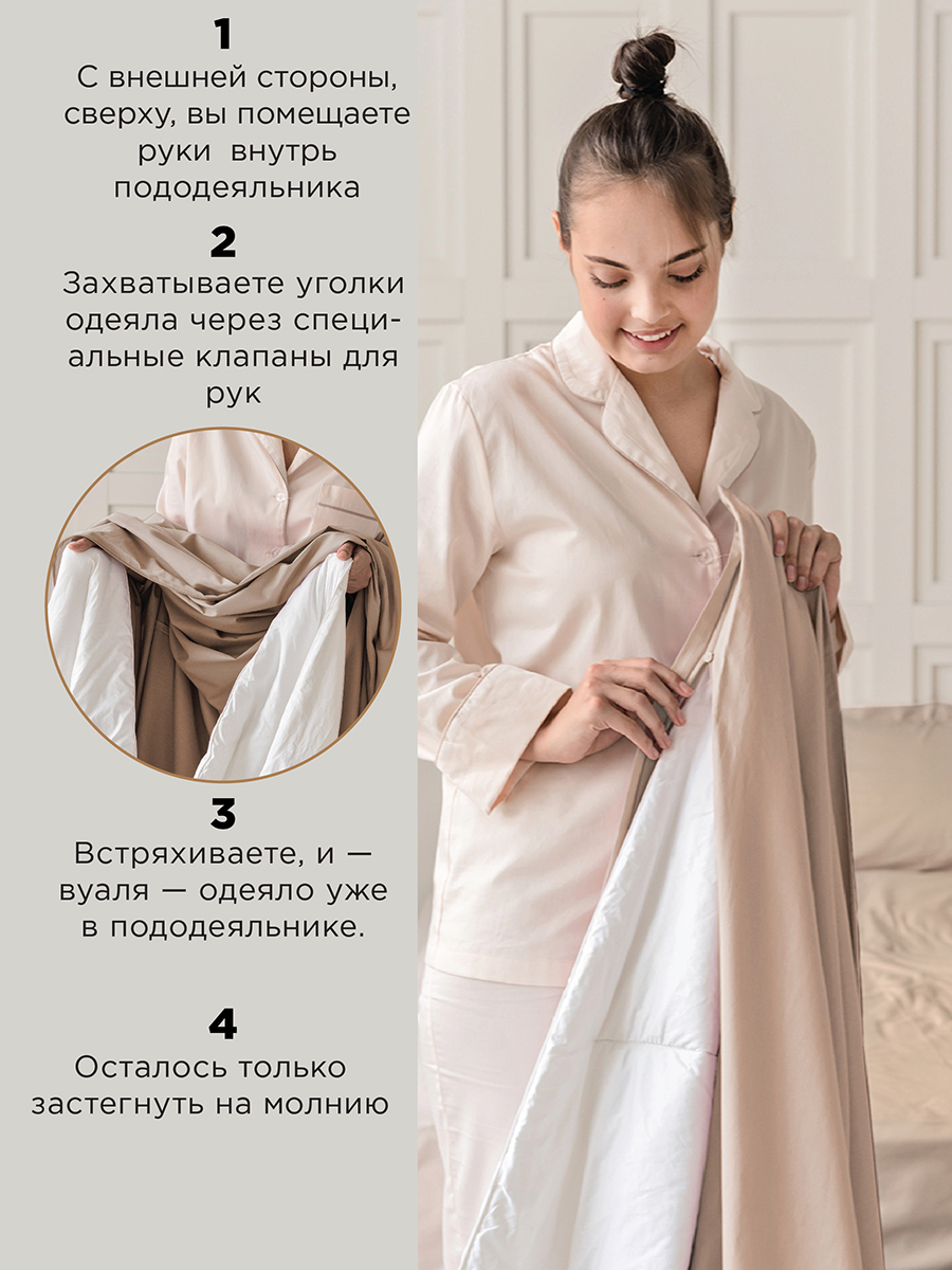 Превратите рутину в ритуал удовольствия. Клапаны для рук в верхней части пододеяльника — это магия, которую нужно испытать. Больше никакого стресса, только легкая улыбка, когда ваше одеяло послушно занимает свое место. Проверенная технология, которую оценили тысячи покупателей!  Каждая деталь продумана для вашего комфорта.