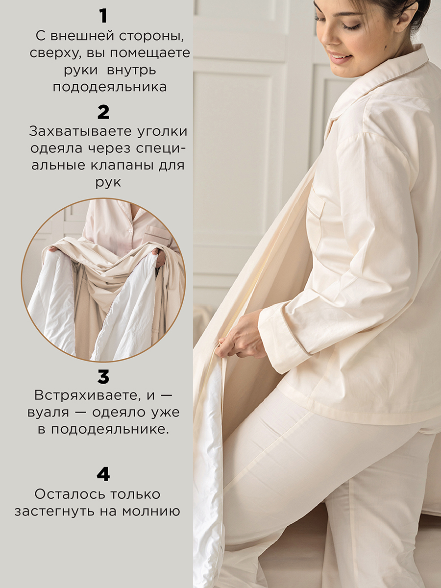 ПОДОДЕЯЛЬНИК С КЛАПАНАМИ ДЛЯ РУК — это то, с чем вы перестанете тяжело вздыхать при вдевании одеяла. Молния во всю ширину пододеяльника в цвет комплекта. Как это работает: