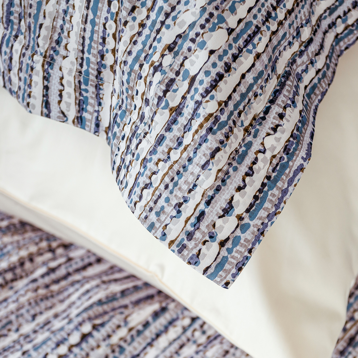 «Данте» - изысканный текстурный узор напоминает спокойное море, чьи волны мягко перекатываются под легким ветром. Тонкие, плавные линии в сине-белой гамме создают ощущение глубины и умиротворения, идеально подходя для современного интерьера. Сдержанная палитра и минималистичный дизайн добавляют спальне уют и элегантность, не перегружая пространство.
