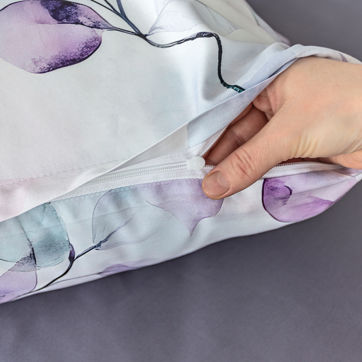 • «Невидимая» молния во всю ширину по нижнему краю пододеяльника. Для быстрой и удобной смены постельного белья в верхней части пододеяльника расположены клапаны для рук. Сменить пододеяльник можно за 30 секунд.