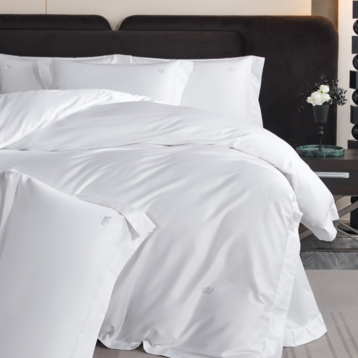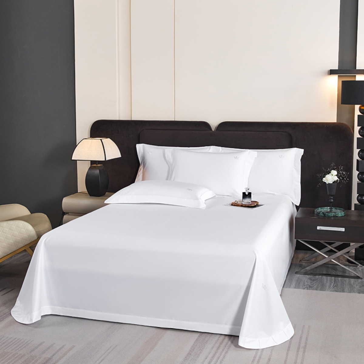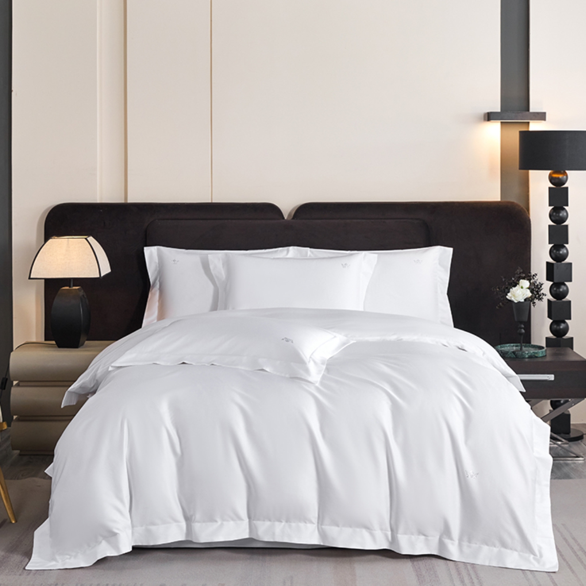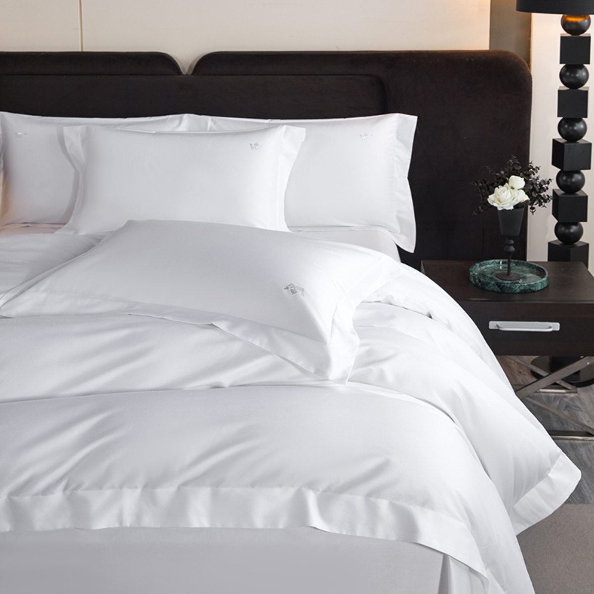 Кручёная нить придаёт материалу дополнительную прочность и создаёт эффект премиального сияния. Сатиновое плетение обеспечивает шелковистую гладкость: ткань остаётся прохладной на ощупь, но при этом уютной и тёплой, подстраиваясь под тело и делая отдых особенно комфортным.