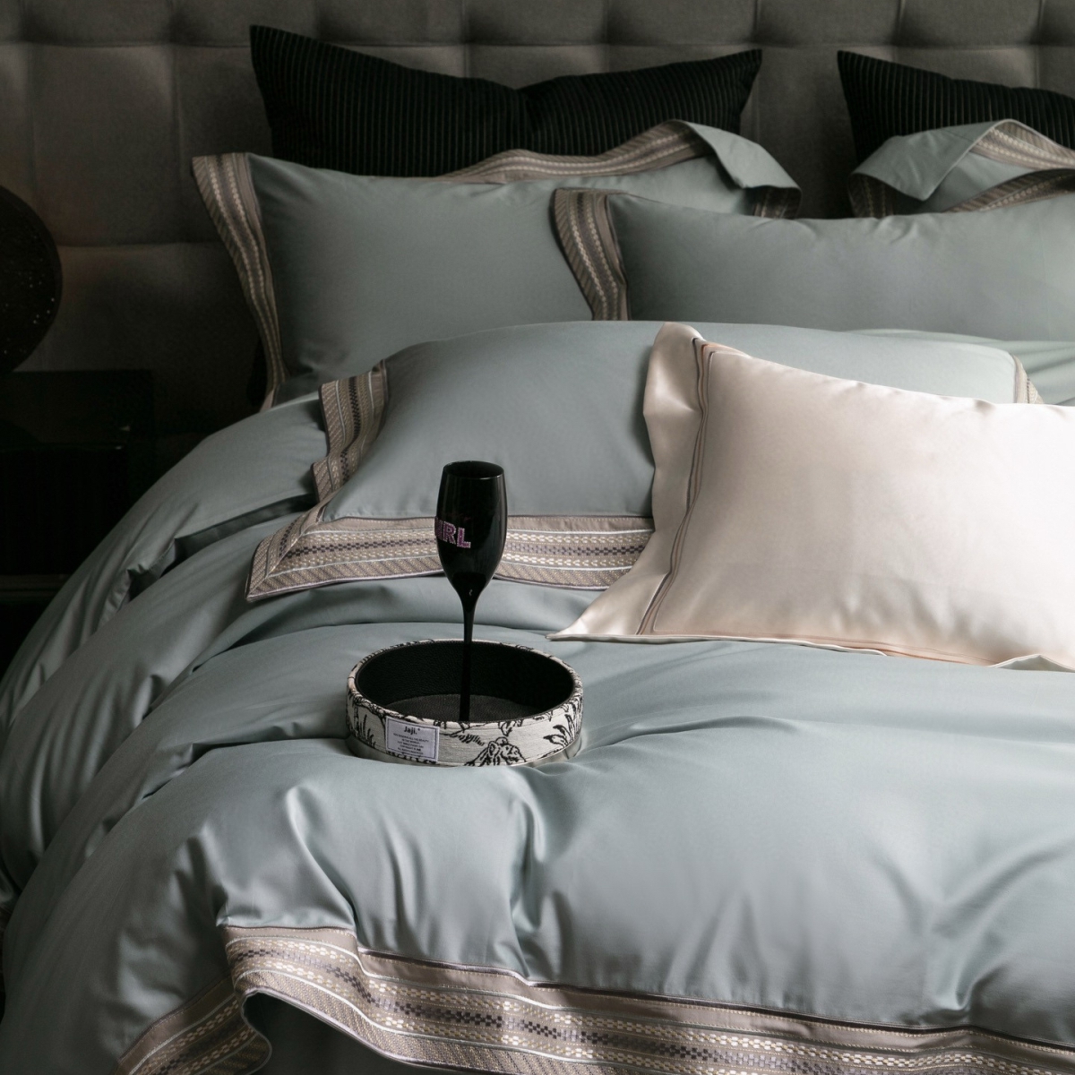 Кручёная нить придаёт материалу дополнительную прочность и создаёт эффект премиального сияния. Добавление шёлка усиливает тактильные ощущения: ткань остаётся прохладной на ощупь, но тёплой в объятиях, а её уникальная способность подстраиваться под тело делает отдых особенно комфортным.