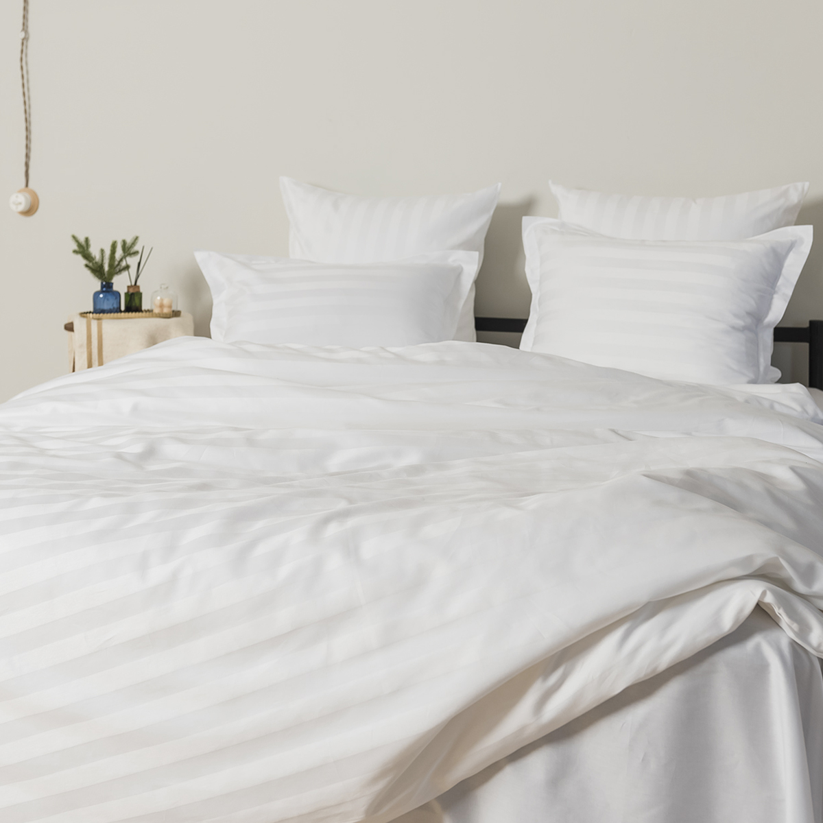 Однотонный стильный пододеяльник произведен из ткани страйп-сатин – 100% хлопок с жаккардовым рисунком в виде полос 3х3.