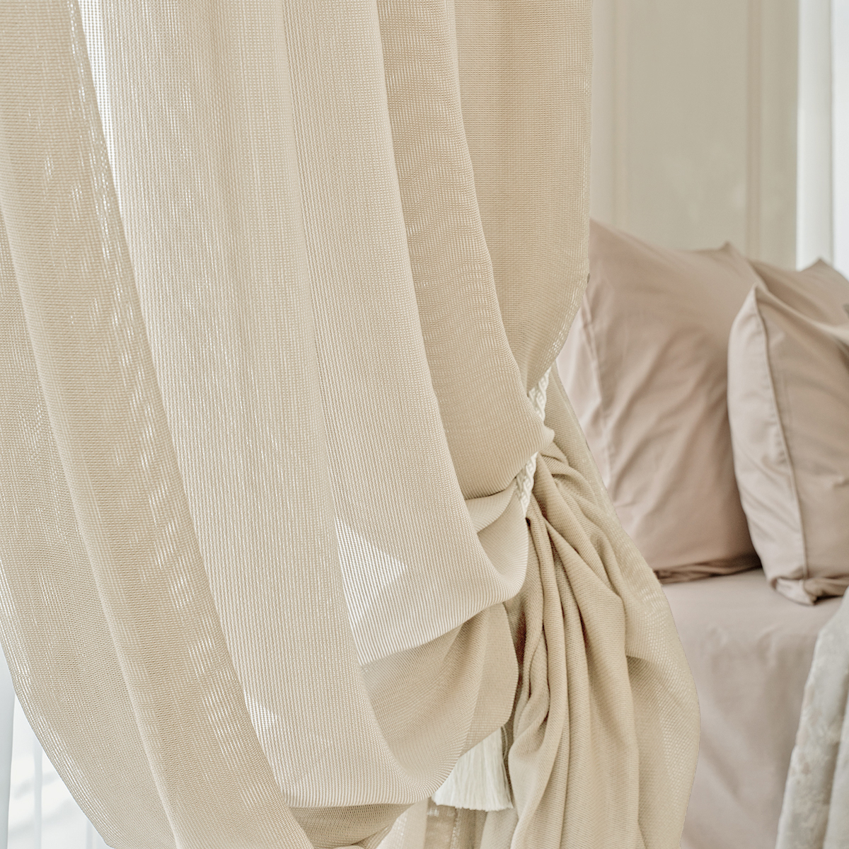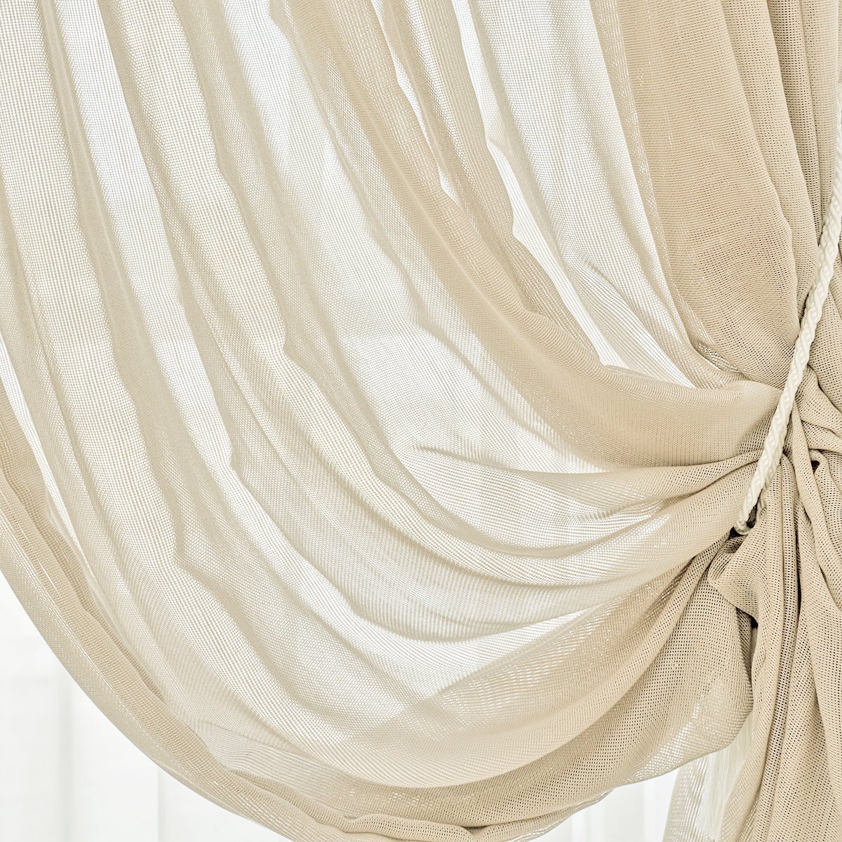 Легкая невесомая и в тоже время особо прочная, износостойкая ткань соткана в виде сетки. Натуральная фактура очень мягкая, приятная на ощупь. Прекрасно драпируется, может использоваться как самостоятельный декор окна.